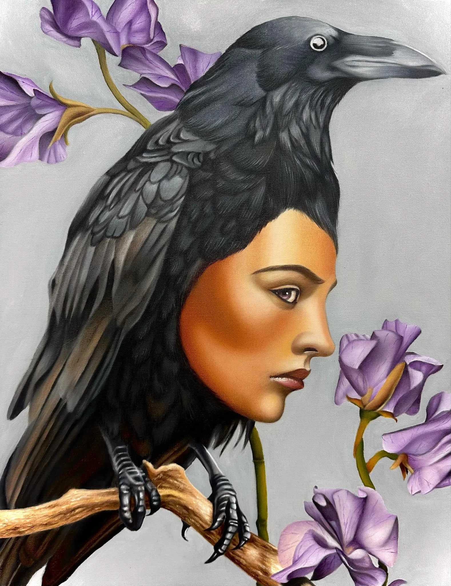 The Raven is a surreal fusion of human and bird, embodying mystery, wisdom, and introspection. A woman’s face seamlessly emerges from the body of a raven, perched solemnly among delicate purple flowers. Her gaze is sharp yet contemplative, as if caught between two realms—instinct and reason, earth and sky. The raven, often seen as a symbol of prophecy and transformation, suggests a story of inner vision and silent strength. The floral elements soften the composition, offering contrast and balance. This piece invites viewers to explore the duality of intellect and intuition, and the quiet power of observation.